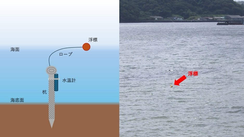 水温計設置様式の模式図(左)と海面に浮かぶ浮標(右)
