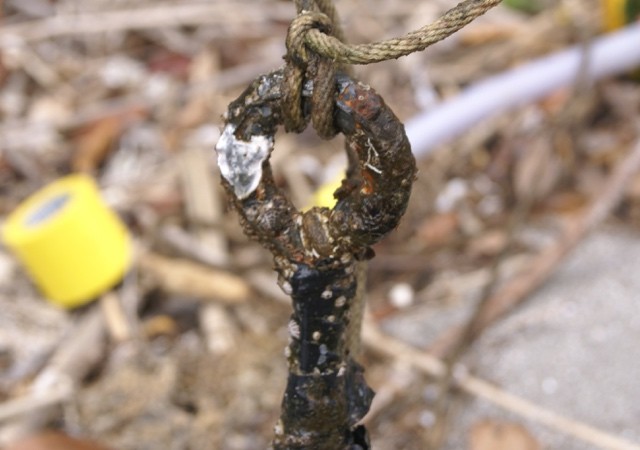 このロープ、多少の波ではビクともしないのですが、ある日突然切れたり傷ついたりすることがあります。こういった場合、ロープあるいはロープが結ばれている先(この場合は杭)への生物付着が原因となっているケースが多々見られます。特にフジツボなどの硬い殻を持った固着生物は大敵で、殻とロープ擦れるとロープがダメージを負うことになってしまいます。今回ご紹介した温度計については、胴付長靴着用して直ぐにアクセスできる場所に設置してあることから、対策としては人力でまめにメンテナンスすることに尽きます。
