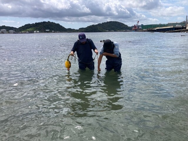 水温計は大潮時においても海面の上に顔を出さない場所に設置し、少し離れた場所からでも設置場所が確認できるようにロープ介して小さな浮標を取り付けています。